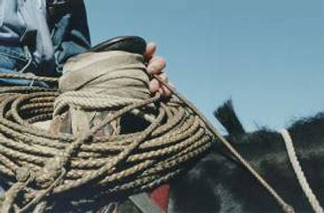 Reata finished and ready to use. Bill made this in the early 70s. He also made his reins. The tuft of hair sticking up at the base of the neck on the horse he’s riding marks her level of training as a bridle horse.