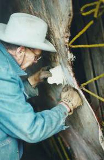 Bill trimming fat off a green hide stretched in the frame. Then when it dries it won’t have so much grease in the rawhide.